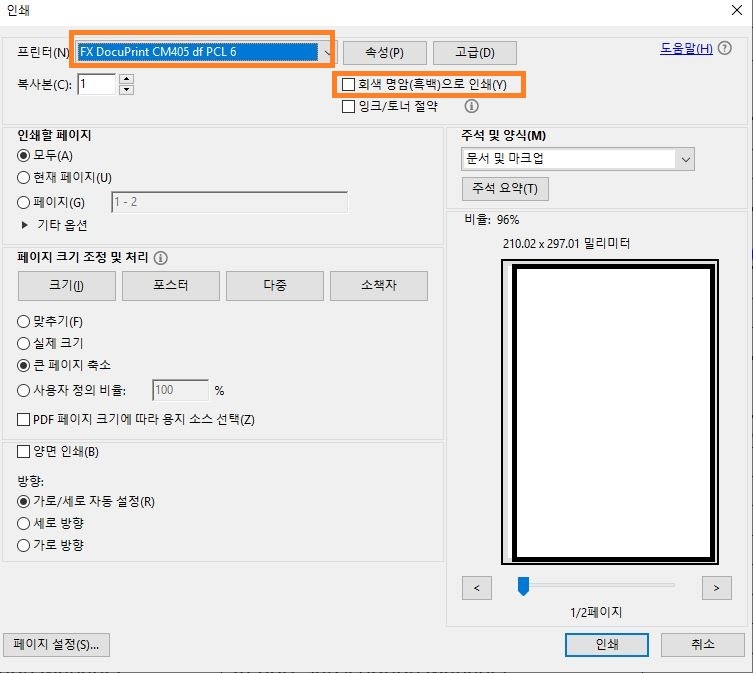 "회색 명암(흑백)으로 인쇄(Y)" 체크박스가 해제 되어있어도 '흑백'으로 나온다면,